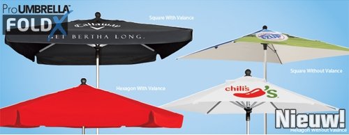 Wir möchten Sie auf die ProUmbrella ™ vorstellen. Genießen Sie den Schatten und Kühle in der Luft unter einer kommerziellen ProUmbrella ™. Der Schirm hat einen leichten Aluminiumrahmen und Sie können aus einem klassischen quadratischen oder sechseckigen Spitze wählen. Die neue ProUmbrella ™ bietet nicht nur Kühl sondern kann auch als Werbemittel eingesetzt werden, dank der Druckfunktionen.
